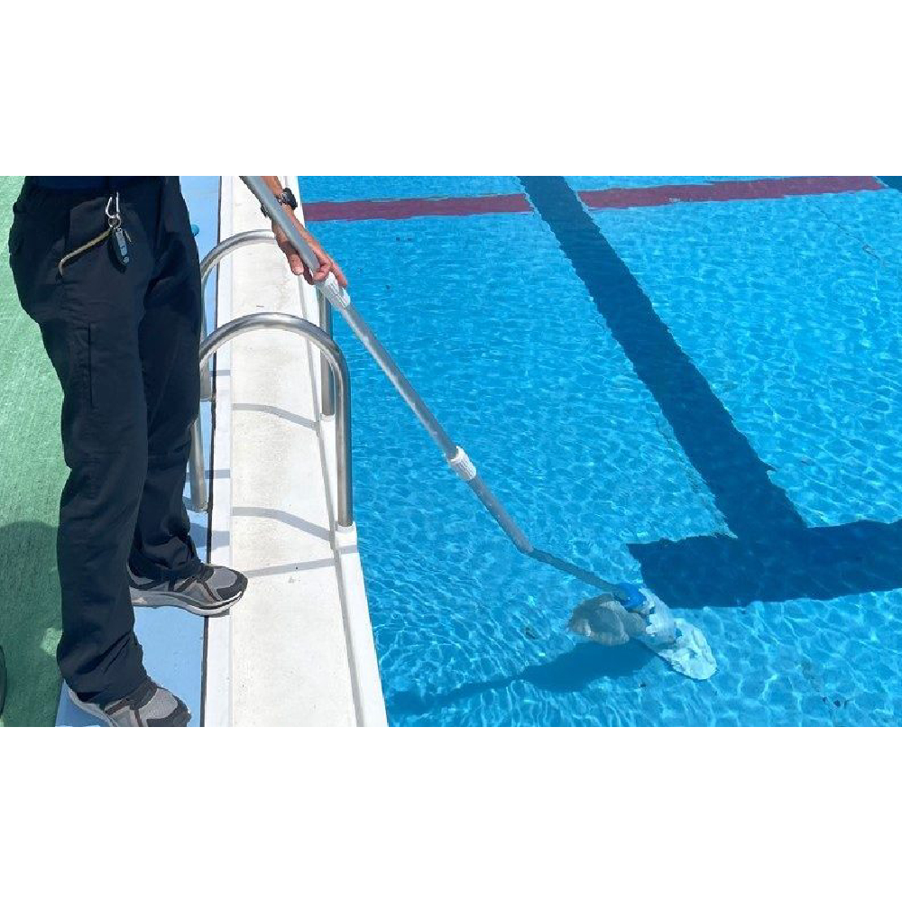 伸縮延長ポールも取付可能で、プールに入らず清掃が可能。